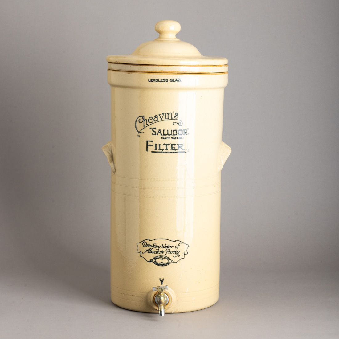 Em grés vidrado com inscrição "Cheavin's Saludor (safe water) Filter" . Sinais de uso, cabelos.