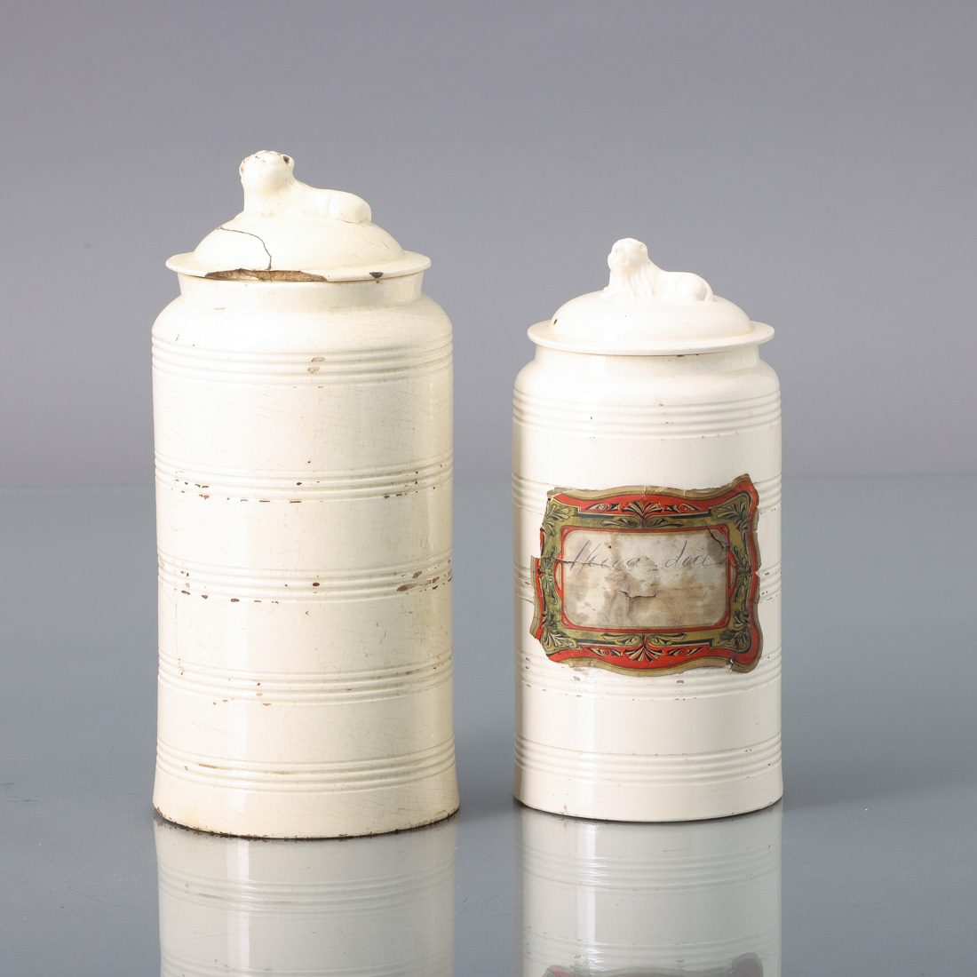 Em loiça pó de pedra, possivelmente da Real Fábrica de Loiça, ao Rato ou Cavaquinho, decoração monocroma, pomos das tampas relevados "leão". Séc. XIX. Sinais de uso, um com falhas, cabelos e craquelé.