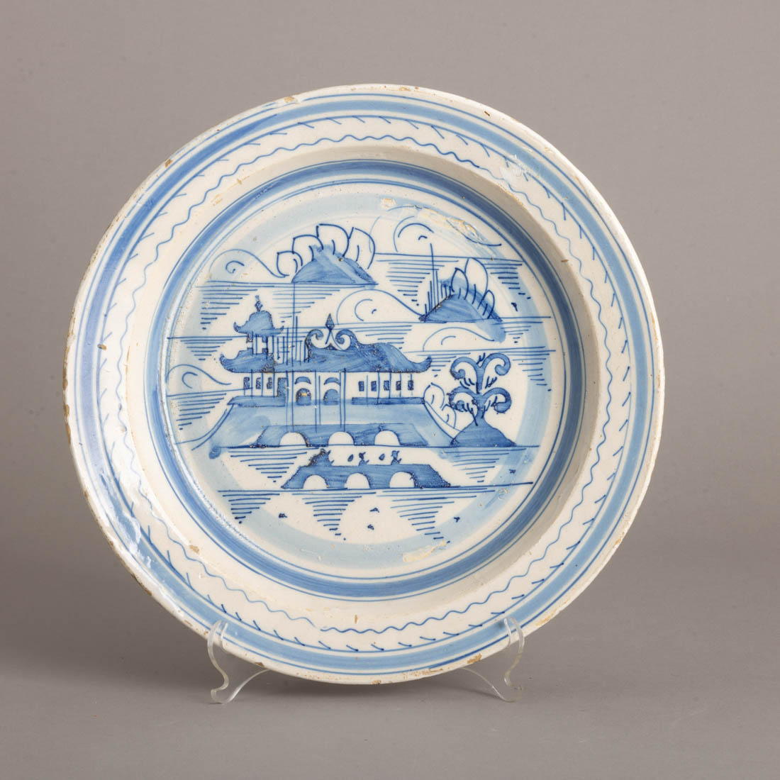 Em faiança portuguesa, decoração a azul "paisagem com pagodes", possivelmente de Miragaia, Séc. XIX. Sinais de uso, pequenas esbeiçadelas.