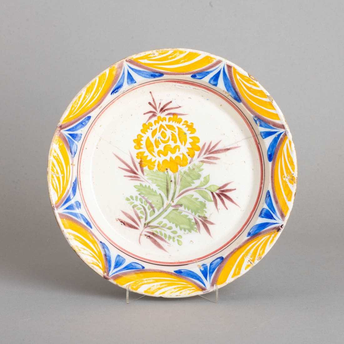 Em faiança portuguesa, decoração policromada com flor. Pequenas esbeiçadelas e cabelos gateados.