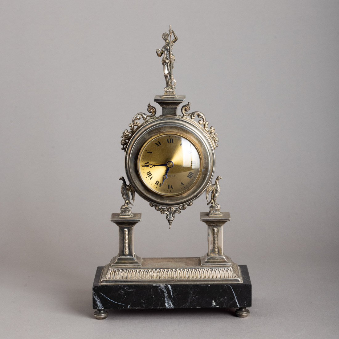 Em metal prateado, decoração relevada com elementos vegetalistas e águias, encimado por figura feminina, base em mármore. Movimento a quartzo. Sinais de uso, pequenas esbeiçadelas na mármore.