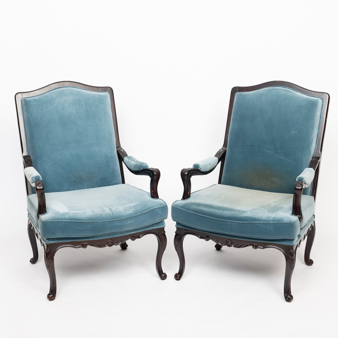 Em madeira entalhada e lacada a negro, assento, costas e apoio de brações estofados a veludo azul. Sinais de uso, pequenos defeitos.