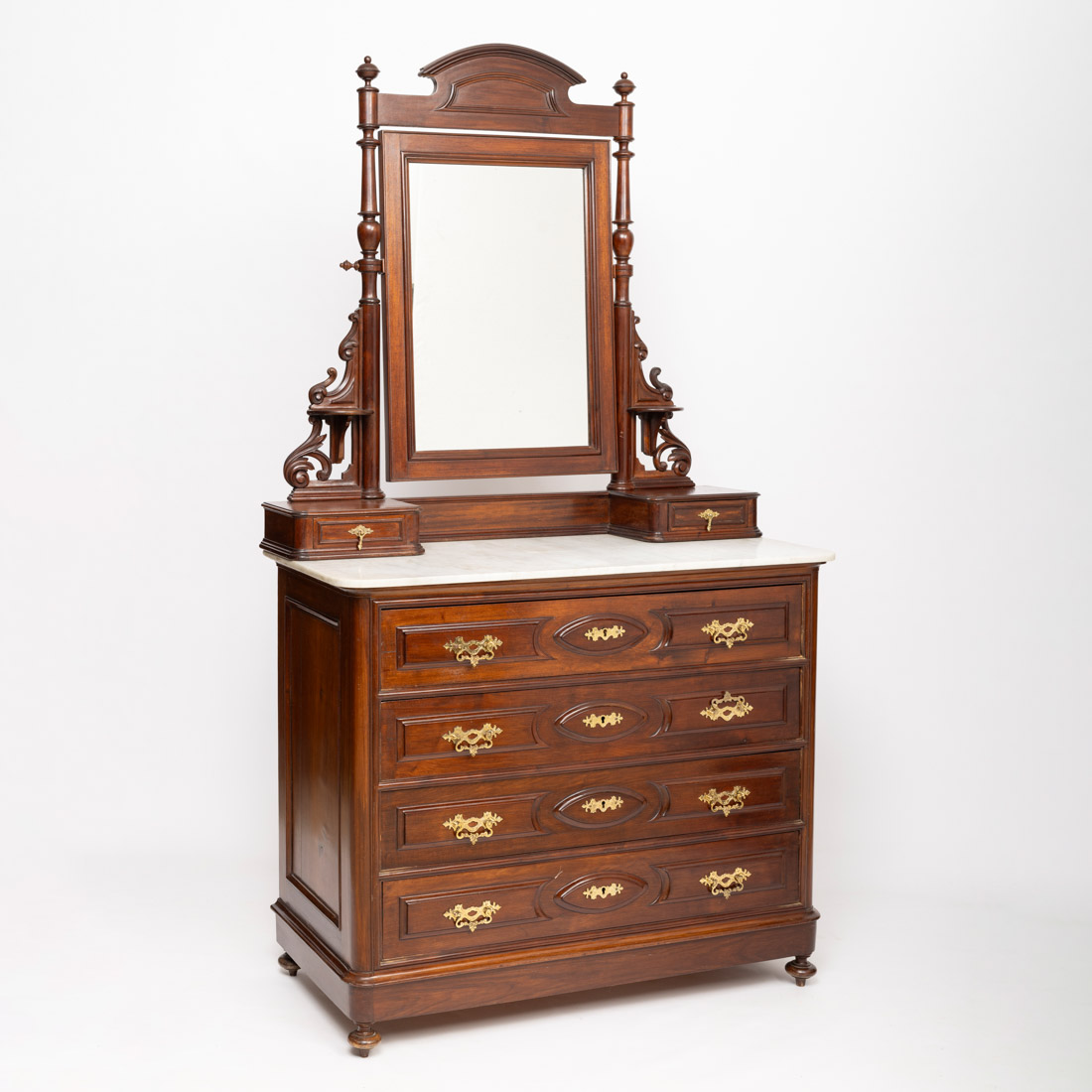 Em pau óleo e outras madeiras, de quatro gavetas, tampo em mármore, toucador com entalhamentos, espelho basculante e duas gavetas. Pequenas falhas e defeitos.