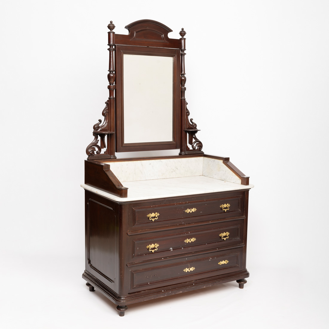 Em vinhático e outras madeiras, de três gavetas, ferragens em metal amarelo, tampo em mármore, toucador com entalhamentos e espelho basculante. Falhas e pequenos defeitos.