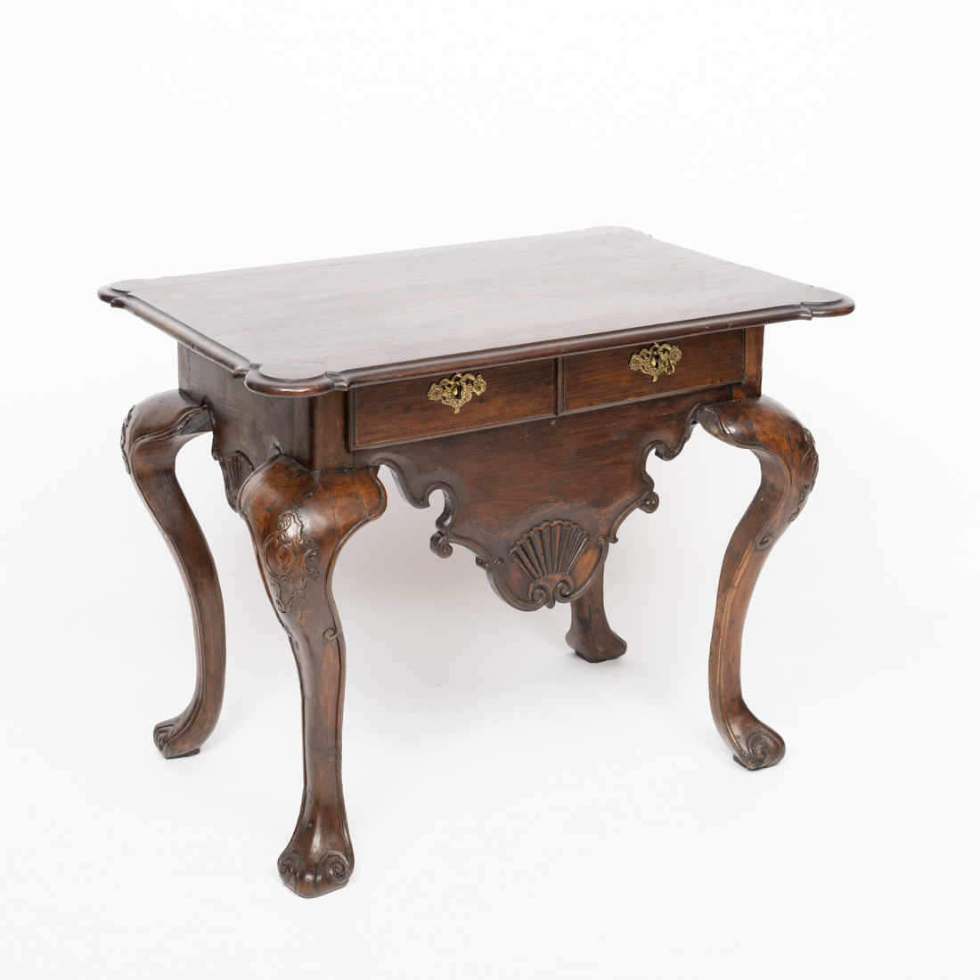 Em castanho e nogueira com entalhamentos, saiais recortados, pernas curvas. Pequenos defeitos e restauros.