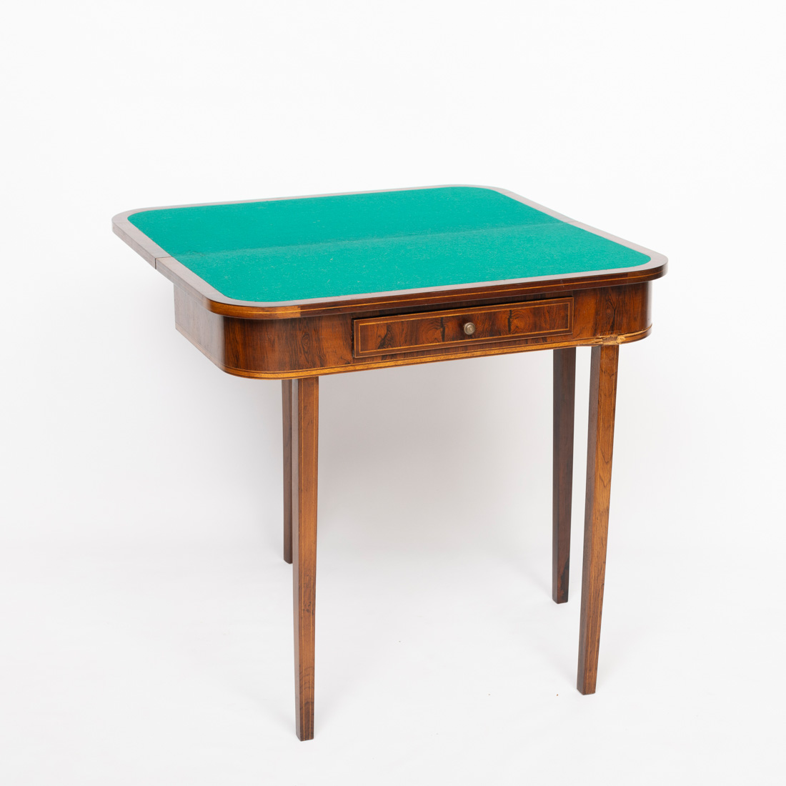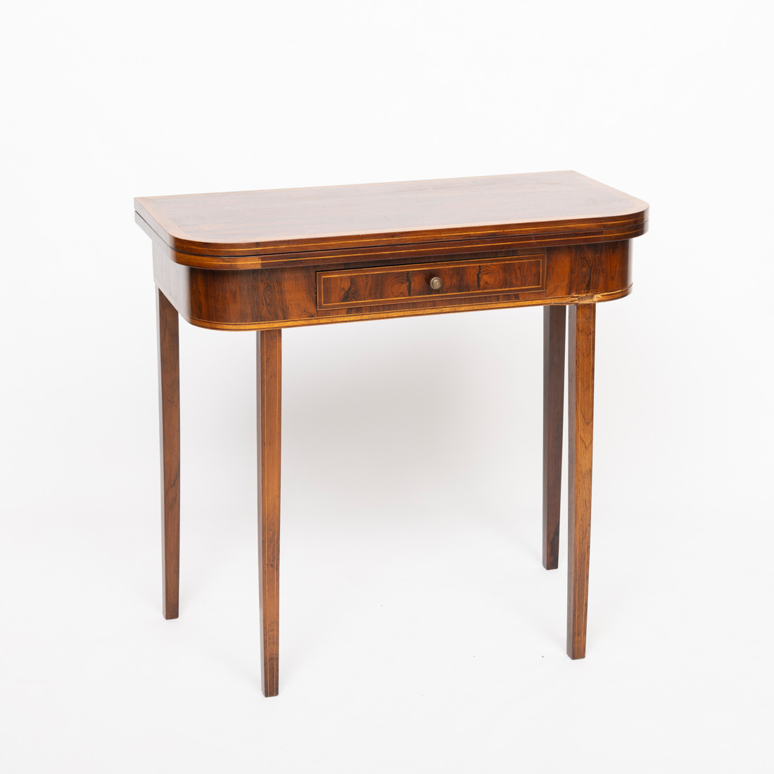 Estilo D. Maria, em pau santo e folheada a pau santo com faixas e filetes em pau cetim. Falhas e defeitos pernas.