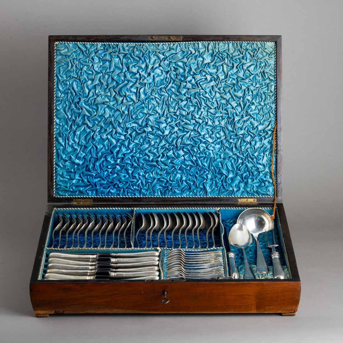 Em prata portuguesa do Séc. XIX, marca de ensaiador do Porto (P-80) Guilherme Gomes Mancilha e de ourives (P-396) João Joaquim Monteiro, decoração guilhochada e gravada "folha". Composto por quatro peças de servir, talheres de carne, colheres de sopa, dechá e concha de açucar. Com estojo. Sinais de uso. Peso total aprox: 3549 g.
