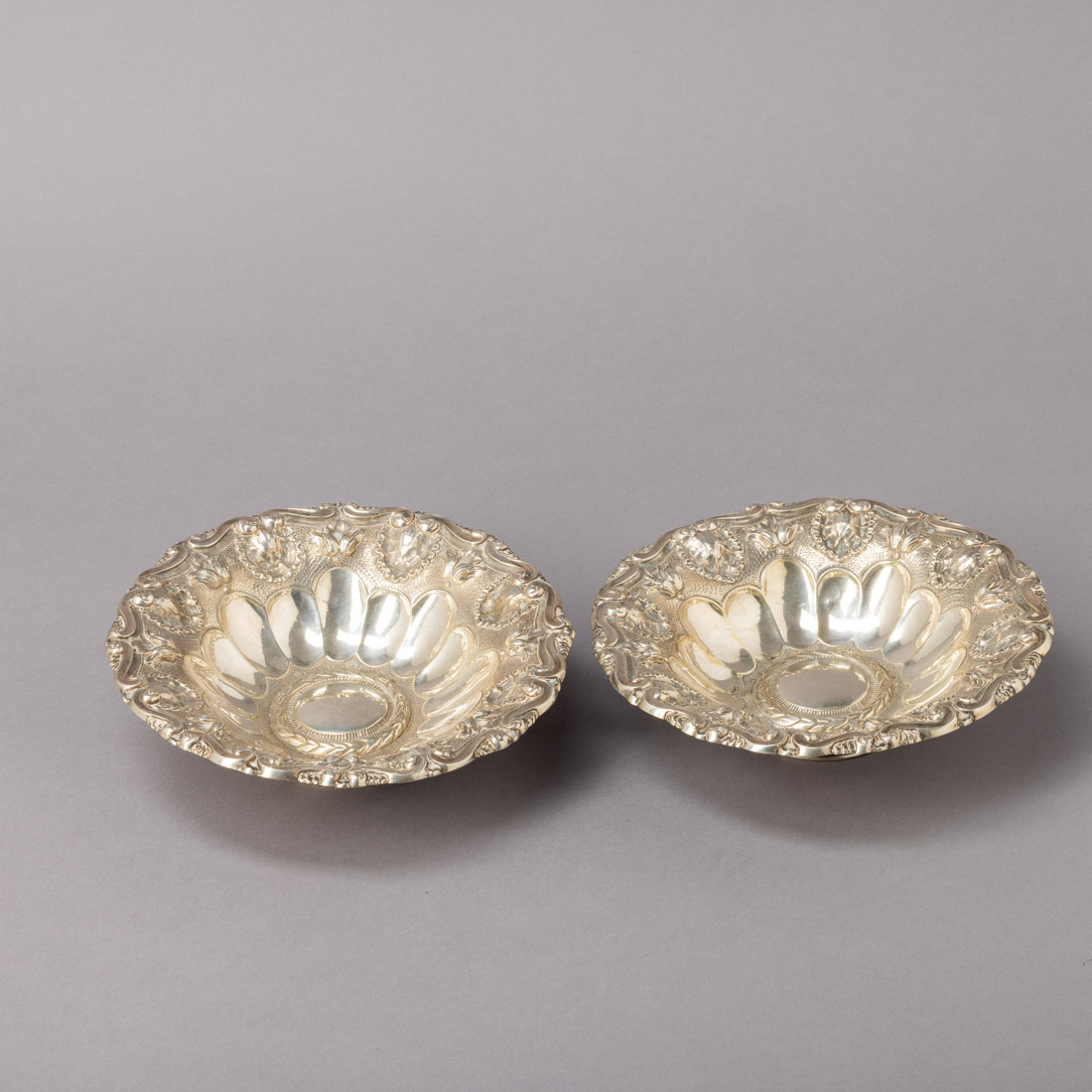 Em prata portuguesa contraste javali (1887-1937) de 833, decoração gomada e relevada com enrolamentos e concheados. Sinais de uso, pequenas amolgadelas nos pés.