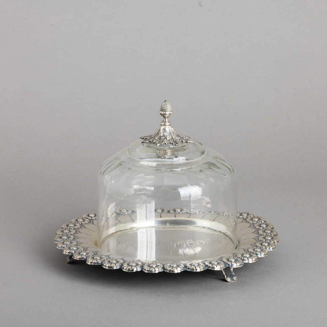 Base em prata portuguesa contraste javali (1887-1937) de 833, aba relevada decorada com malmequeres, tampa em cristal lapidado, pega em prata da mesma época. Sinais de uso.