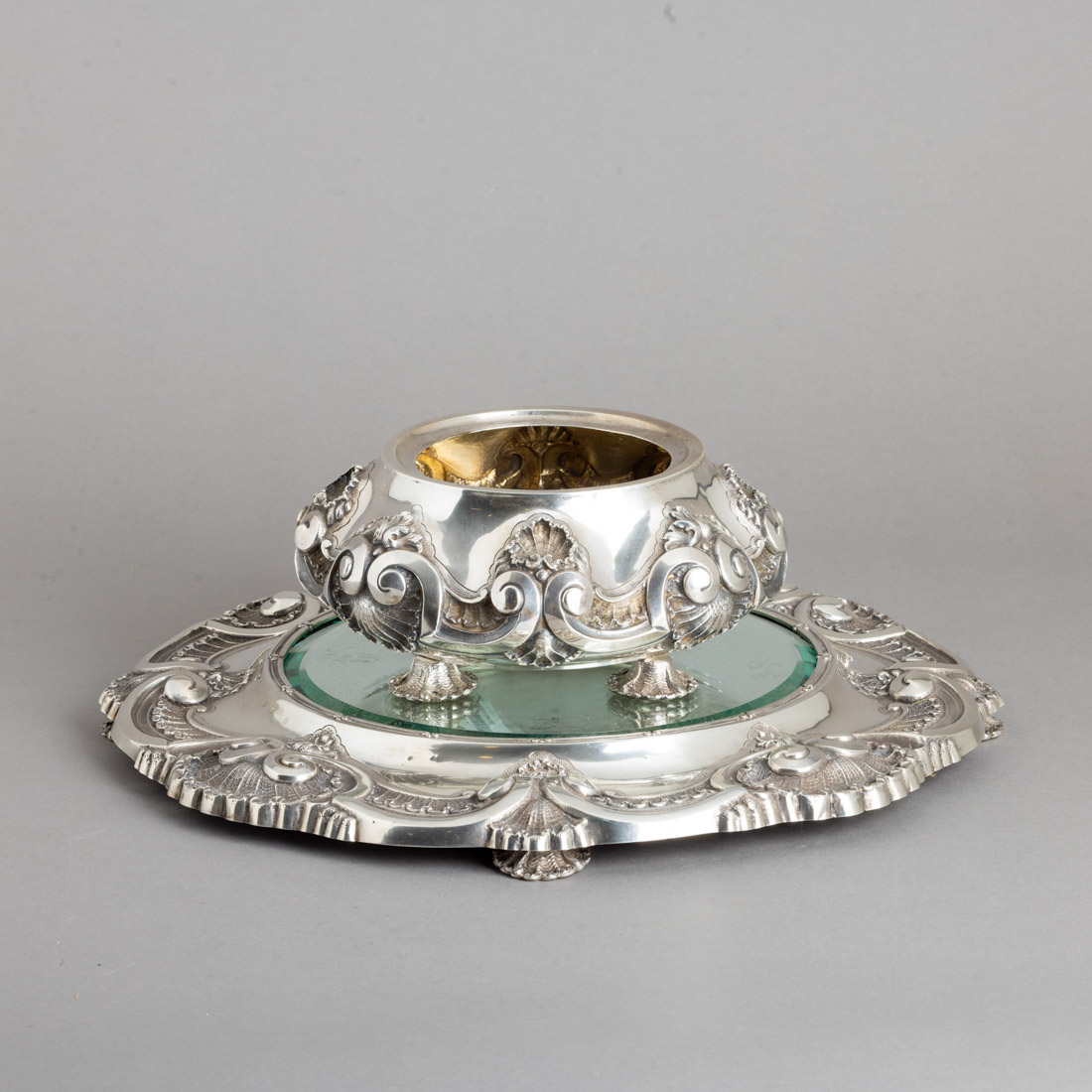 Em prata portuguesa contraste águia (1887-1937) de 833, decoração relevada com enrolamentos e concheados, plateau com espelho biselado. Falta grelha. Pés da floreira posteriores. Sinais de uso.