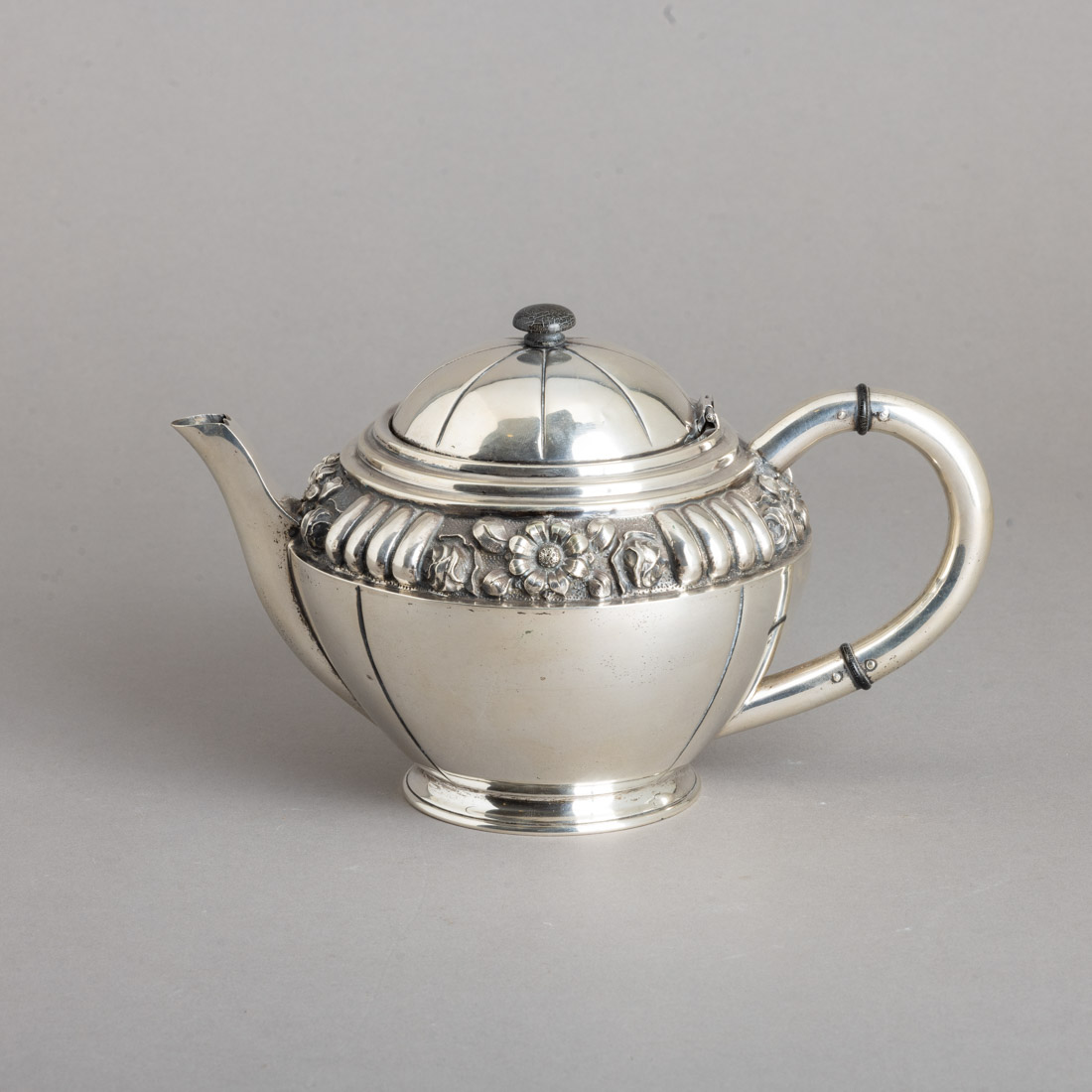 Em prata portuguesa contraste águia (1938-1984) de 833, decoração relevada com flores e gomados, pomo em madeira. Sinais de uso, pequenas amolgadelas.