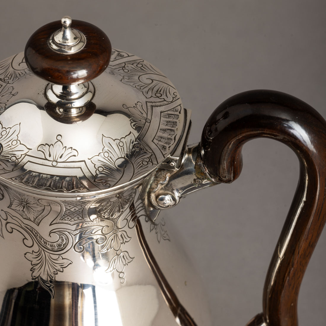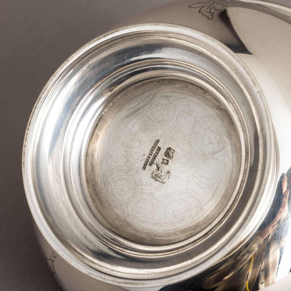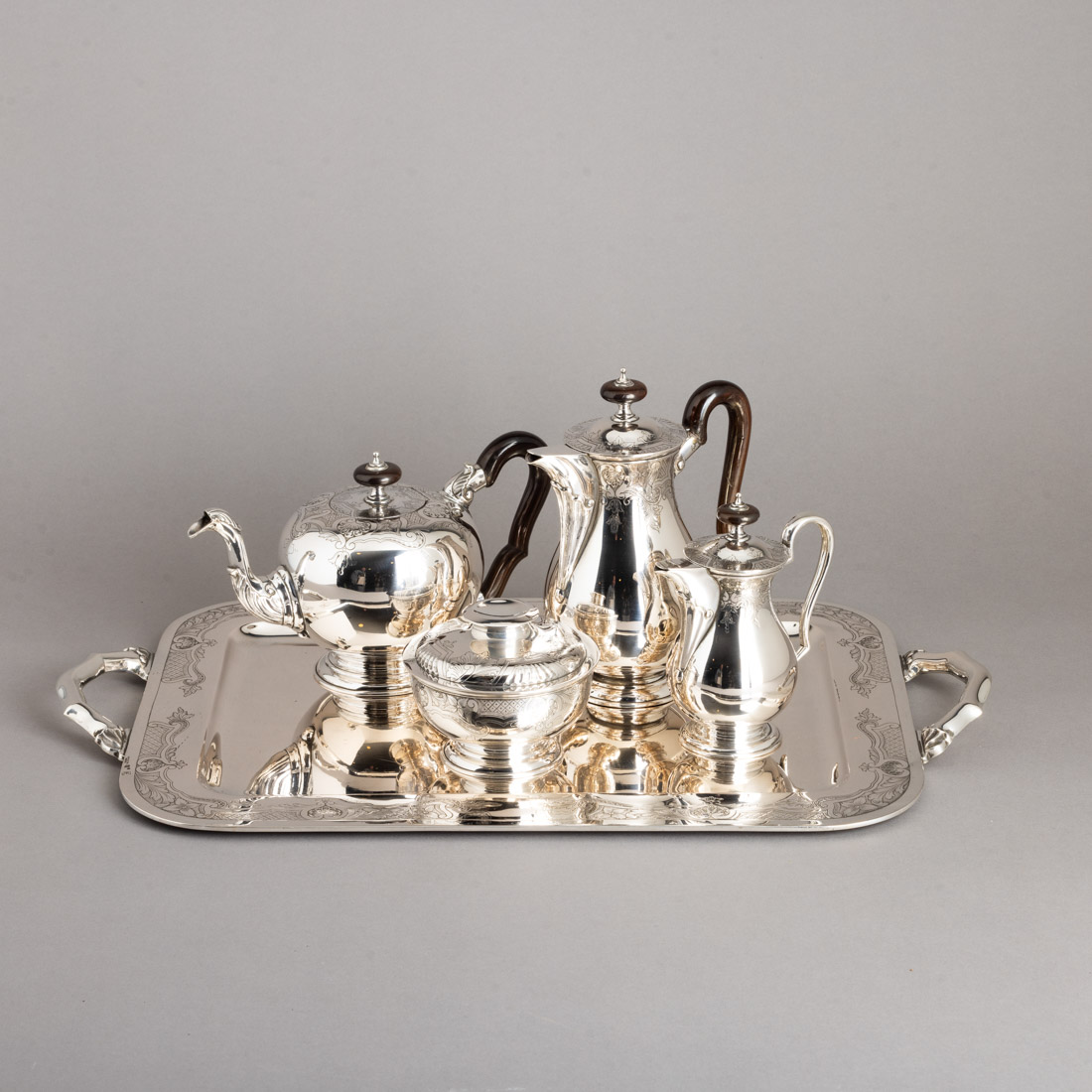 Em prata portuguesa contraste águia (1938-1984) de 833, marcada David Ferreira e "LF", decoração relevada e gravada com elementos vegetalistas. Composto por bule, cafeteira, açucareiro, leiteira e bandeja. Sinais de uso. Peso total aprox: 4075 g. Dim. Cafeteira: 20 cm. Bandeja: 57x35 cm.