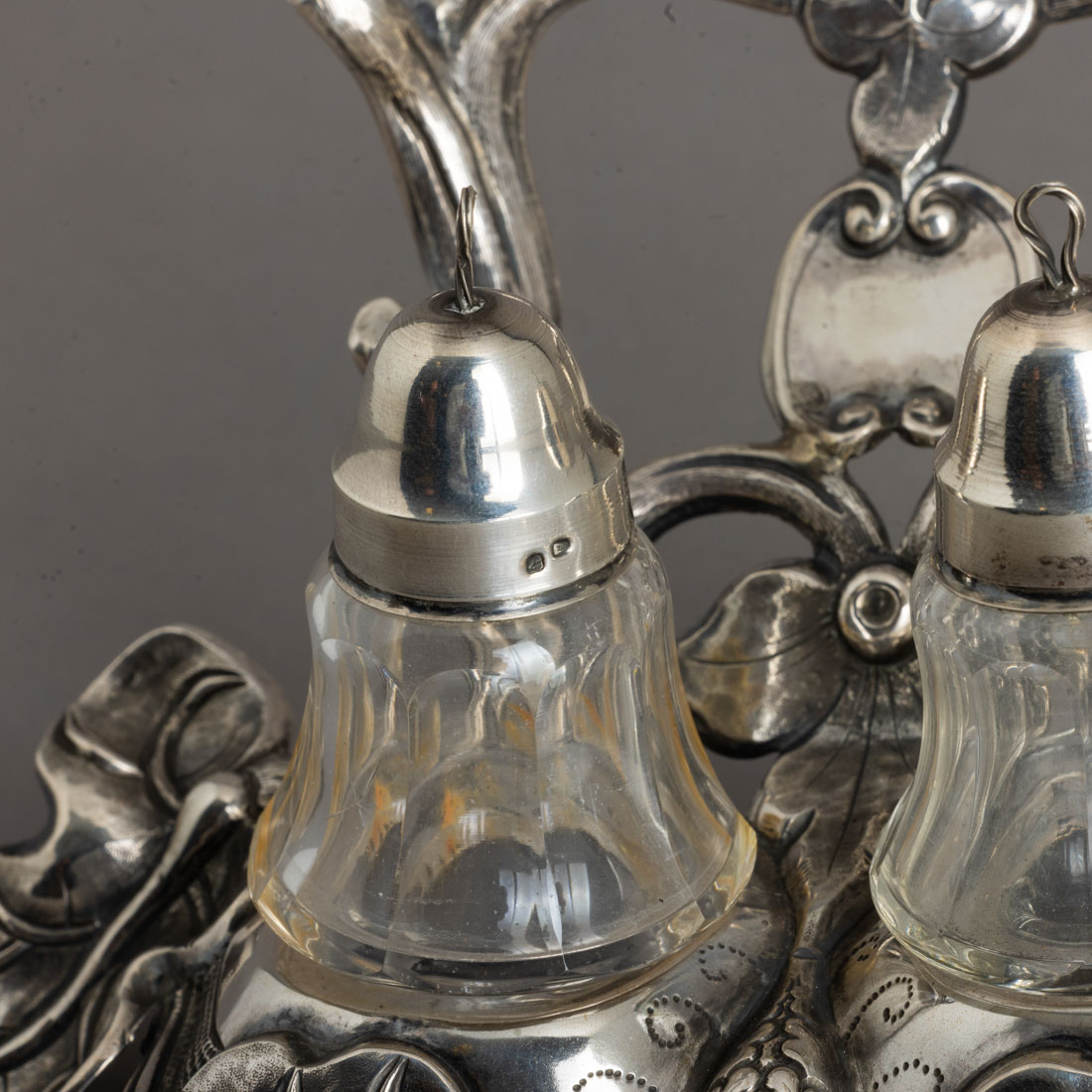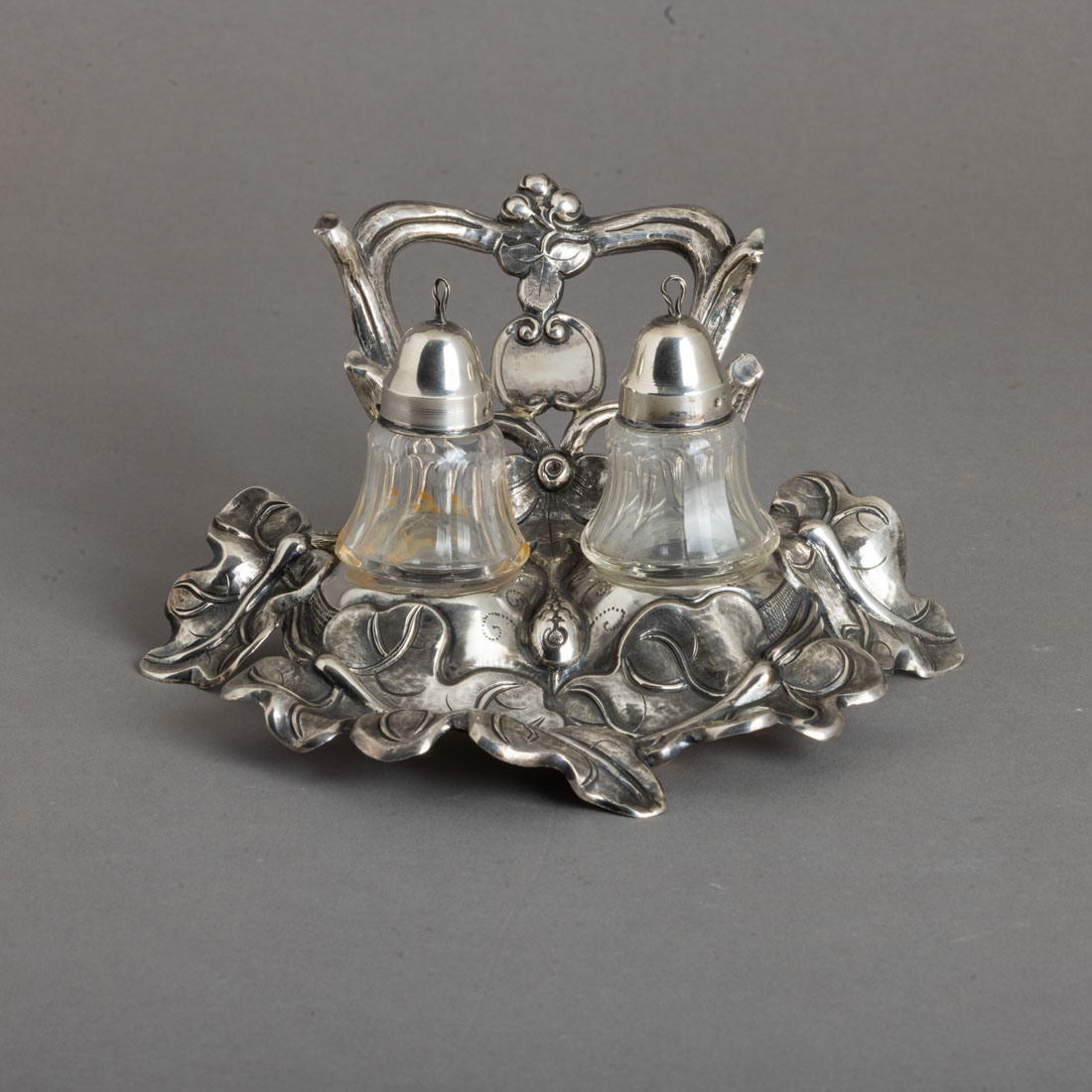 Em prata portuguesa do Séc. XIX, marca de ensaiador do Porto (P-63) José Rodrigues Teixeira e de ourives (P-403) José Marques Guedes, decoração relevada com folhagem, recipientes em vidro (um com cabelo), tampas em prata javali. Peso aprox.: 143 g. (só prata) Dim: 9x17,5 cm.