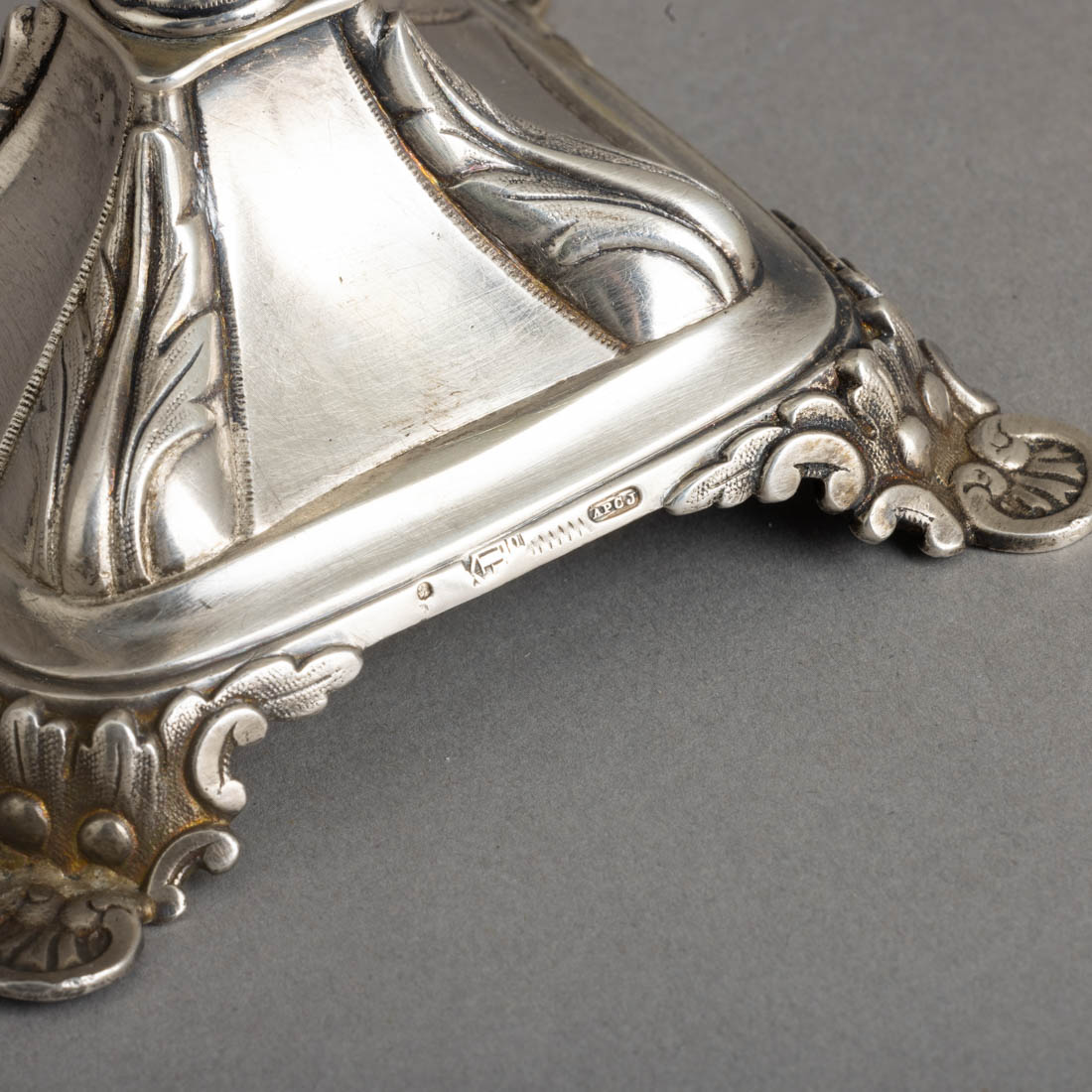 Em prata portuguesa do Séc. XIX, marca de ensaiador do Porto (P-64) José Rodrigues Teixeira e de ourives (P-174) datável de 1870-1881, remarcada Cabeça de Velho, decoração vegetalista relevada e gravada. Pequenos defeitos. Peso aprox.: 660 g. Dim.: 20 cm.
