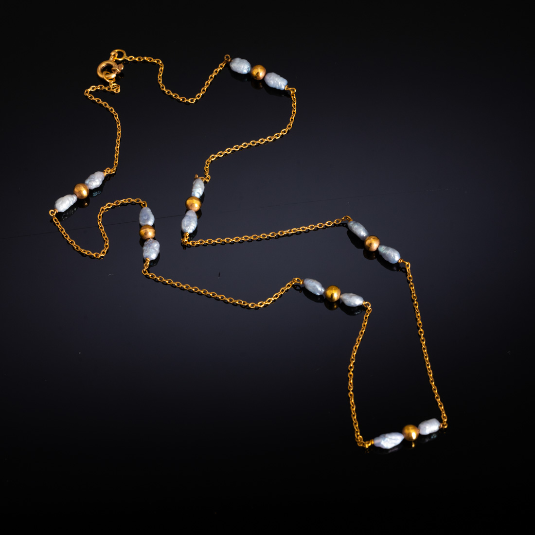 Em ouro português de 19,2Kt., contraste veado (pós 1985), com pérolas de água doce azuis intercaladas com contas. Sinais de uso.