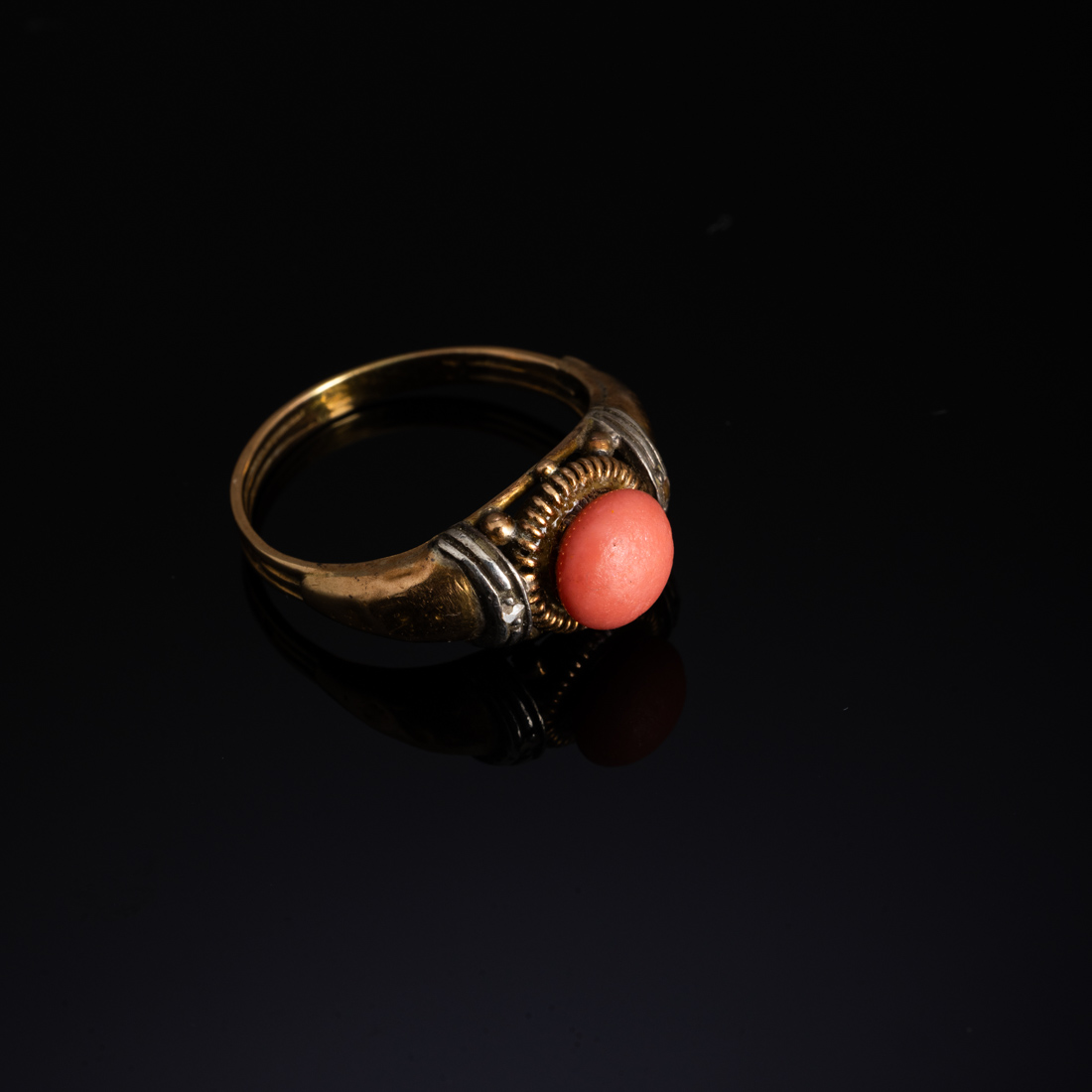 Em ouro português de 19,2Kt., e prata contraste cão e galo (1938-1984) cravejado com coral do Mediterrâneo e dois diamantes talhe rosa. Desgaste e ligeiras amolgadelas.