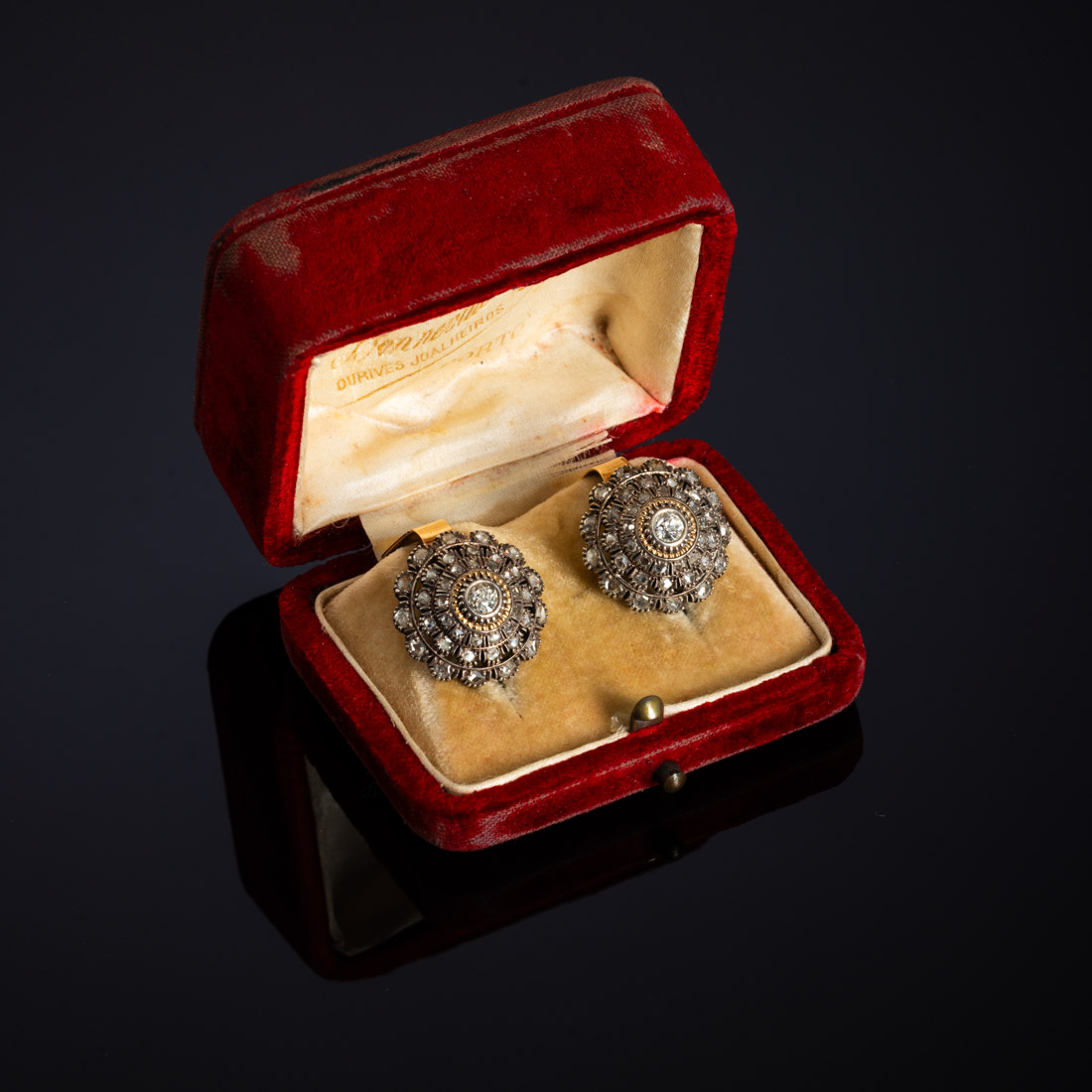 Em ouro e prata cravejada com diamantes em talhe rosa coroada e talhe antigo de brilhante. Séc. XIX/XX. Sem marcas, ao abrigo do Decreto-Lei n.º 120/2017. Sinais de uso.
