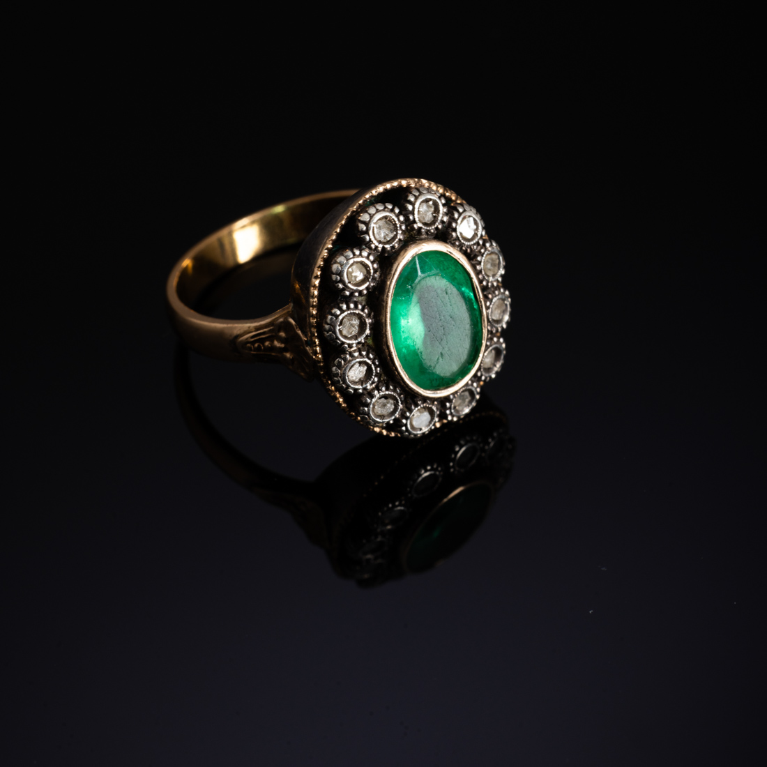 Em ouro e prata cravejada com esmeralda em talhe oval e diamantes em talhe rosa coroada. Sem marcas, ao abrigo do Decreto-Lei n.º 120/2017. Sinais de uso.