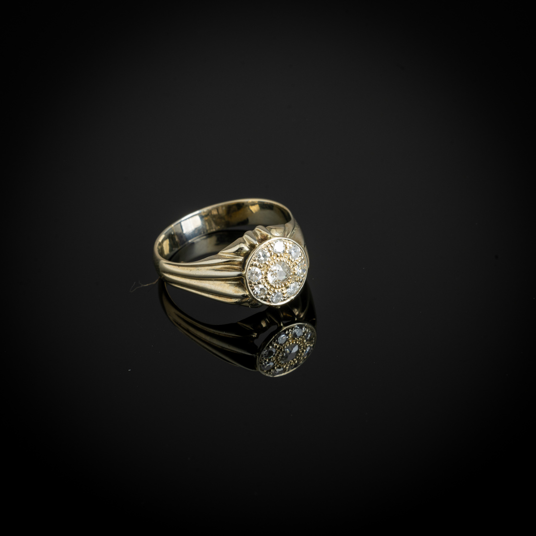Em ouro branco português de 19,2Kt., contraste veado (pós 1985) cravejado com diamantes talhe antigo de brilhante. Sinais de uso.