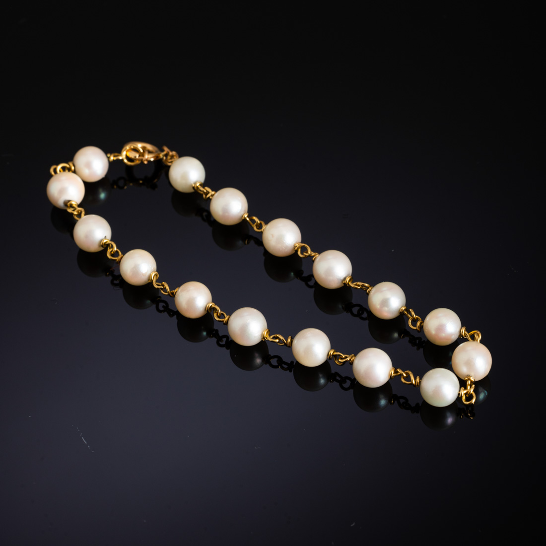 Em ouro português de 19,2Kt., contraste veado (pós 1985) intercalado com pérolas de cultura (não testadas). Sinais de uso.