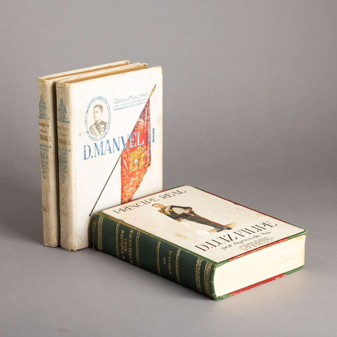 "D. Manuel II" em dois volumes de Rocha Martins e "Principe Real D. Luiz Filipe" por Ayres de Sá, parceria António Maria Pereira, Lisboa 1929. Sinais de uso e pequenos defeitos.