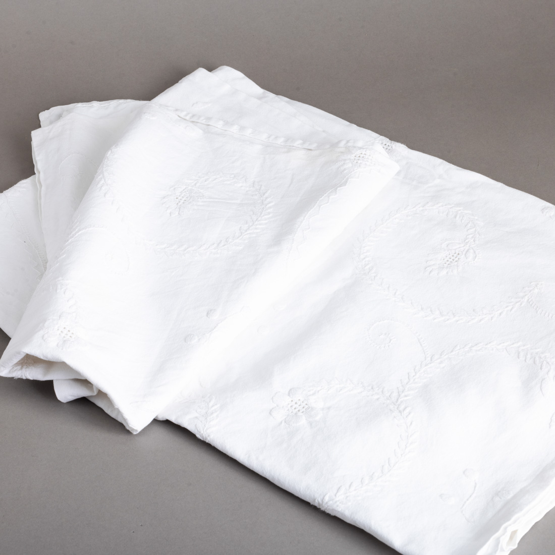Em algodão branco com bordado característico. Sinais de uso e manchas.