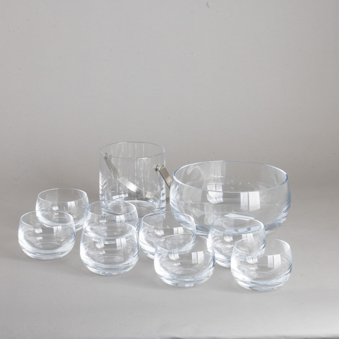 539. BALDE DE GELO, CONJUNTO DE SALADEIRA E OITO PEQUENAS TAÇAS