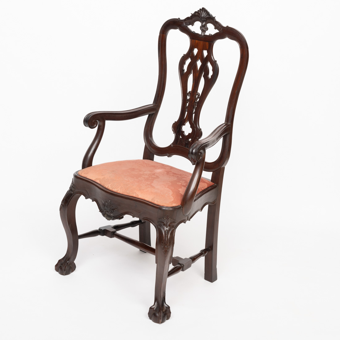 Estilo D. João V/D. José, em pau santo com entalhamentos, espaldar vazado, pés de garra e bola, assento estofado. Pequenos defeitos.