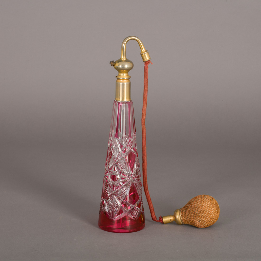 Em cristal bicolor moldado e lapidado, pulverizador em metal dourado. Sinais de uso e defeitos na mangueira.