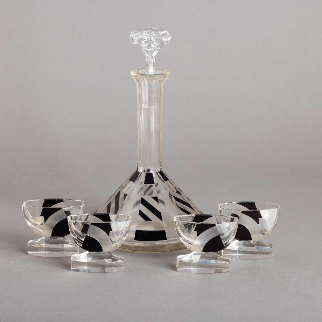 544. GARRAFA E QUATRO CÁLICES DE LICOR ART DECO