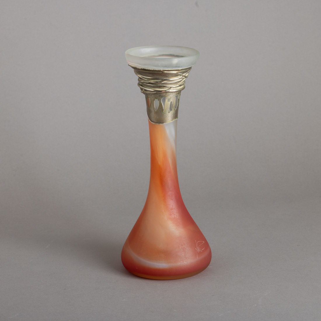 Em pasta de vidro colorido, aplicação em metal prateado, assinada. Sinais de uso.