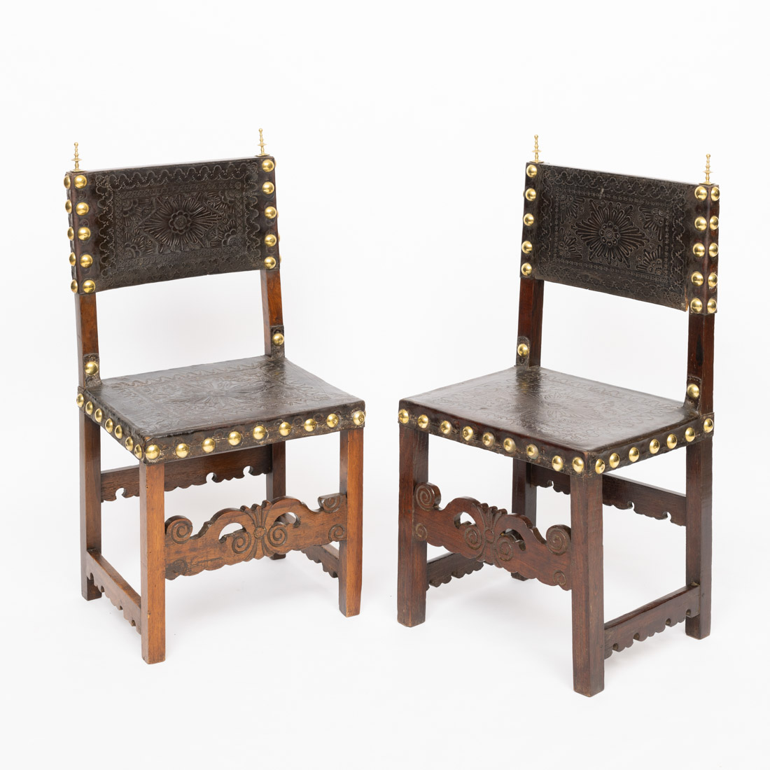 Em diferentes madeiras, assento e espaldar em couro lavrado com pregaria em latão dourado. Séc. XVII. Falhas, pequenos defeitos, vestígio de xilófagos e restauros.