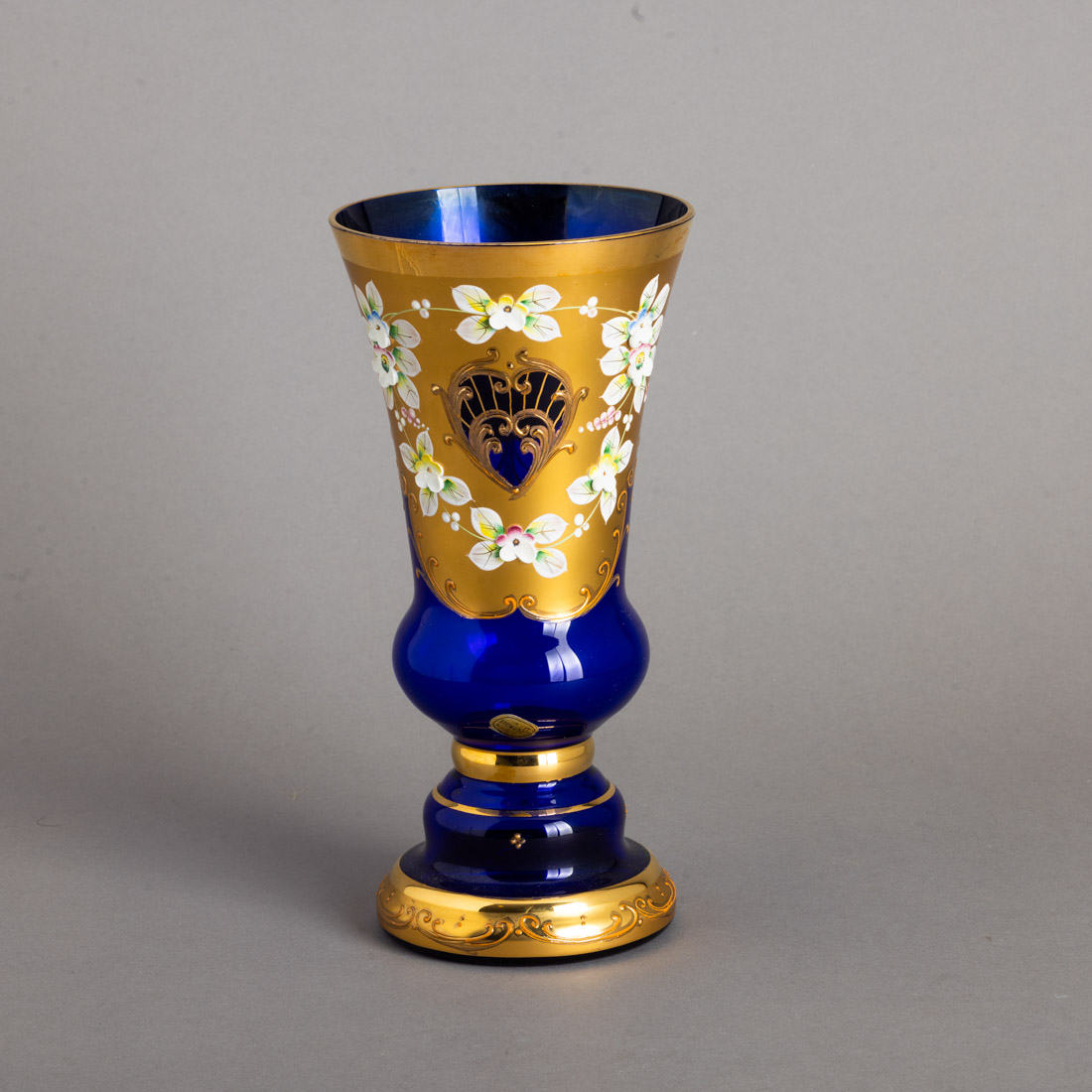 Em vidro colorido da Boémia, decoração policromada e dourada "flores". Marcado. Sinais de uso.