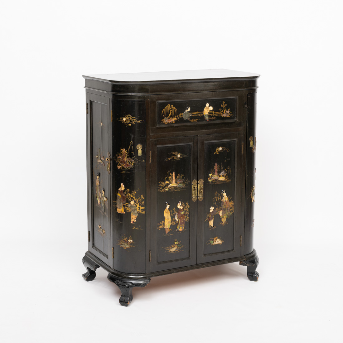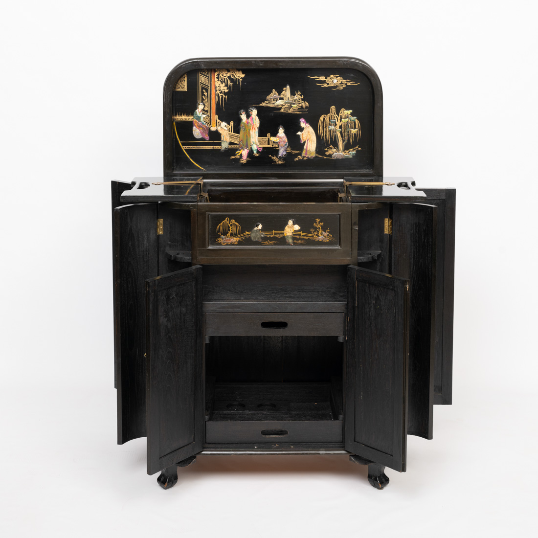 Em madeira lacada a negro e dourado com aplicações em madrepérola e pedras duras "figuras em cena do quotidiano". Pequenos defeitos.