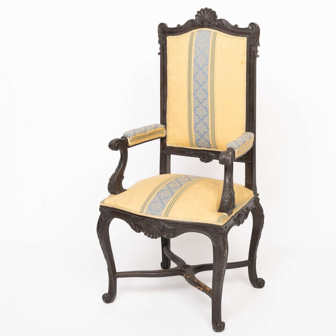 Em madeira escurecida com entalhamentos, pernas unidas por travejamento, assento, costas e apoio de braços estofados a tecido adamascado com listas azuis. Pequenos defeitos.