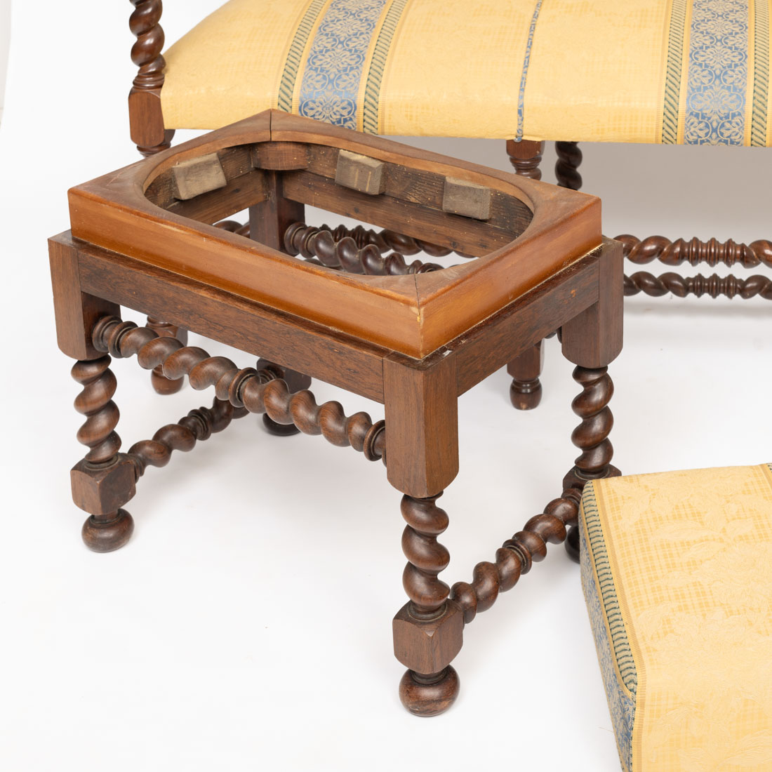 Em pau santo com entalhamentos, pernas e travessas torneadas, assentos e costa estofados a tecido adamascado com listas a azul. Sinais de uso e pequenos defeitos.