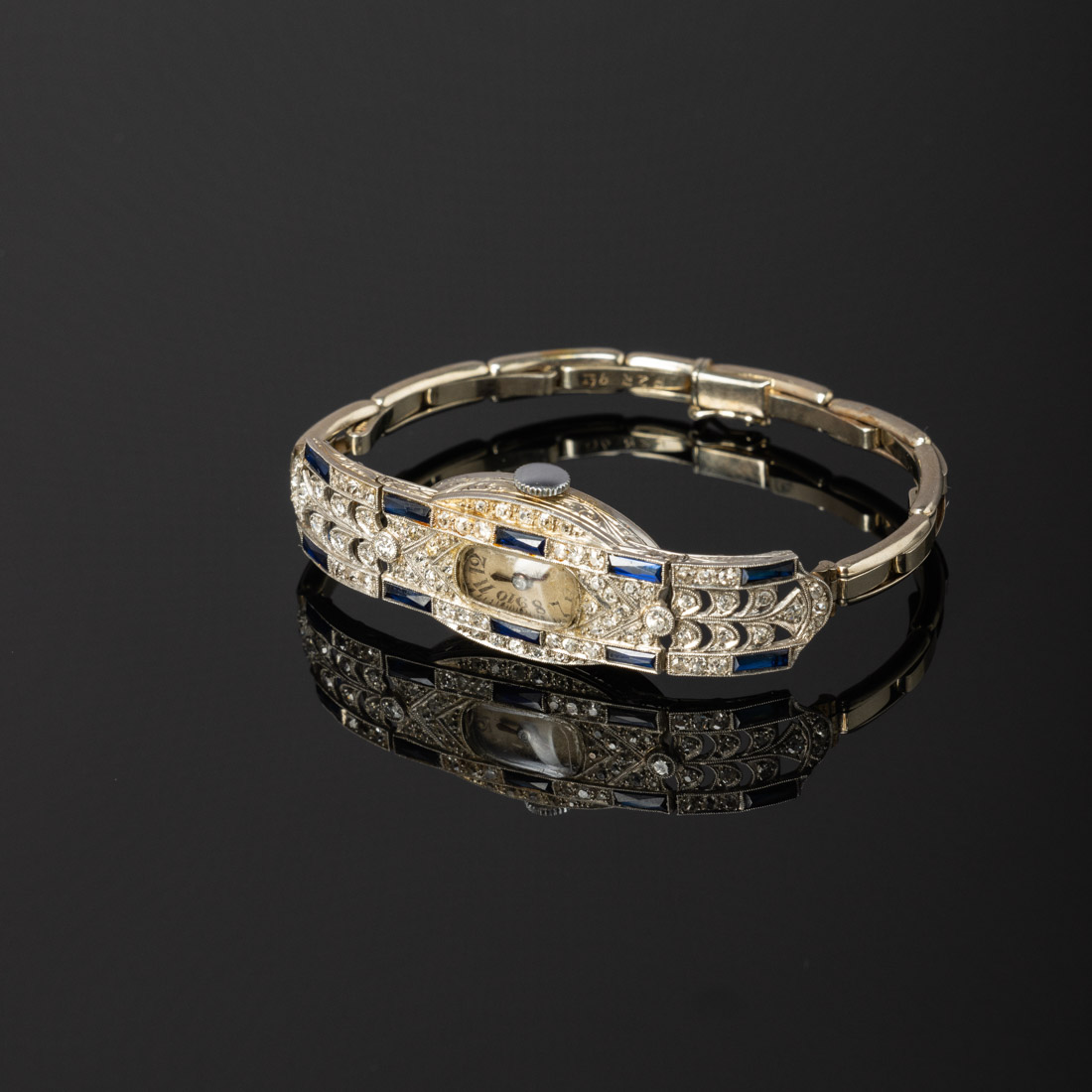 Em platina cravejada com diamantes talhe antigo de brilhante e safiras talhe baguete. Sem marcas, ao abrigo do Decreto-Lei n.º 120/2017. Mecanismo não testado. Sinais de uso.