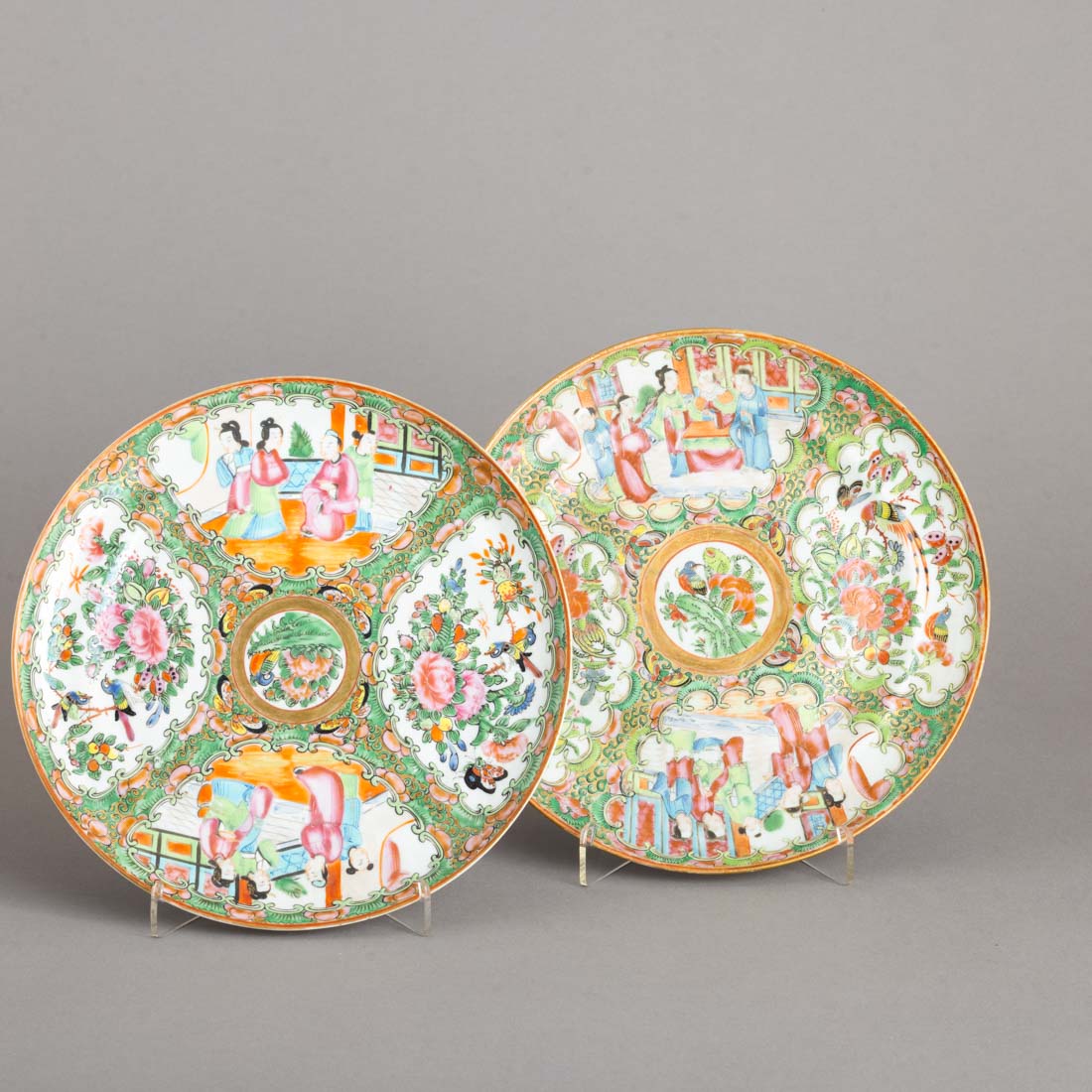 Em porcelana da China, Séc. XIX/XX, decoração policromada e dourada "Mandarim", reserva com figuras em cena de interior, na aba flores, frutos e insectos. Sinais de uso.