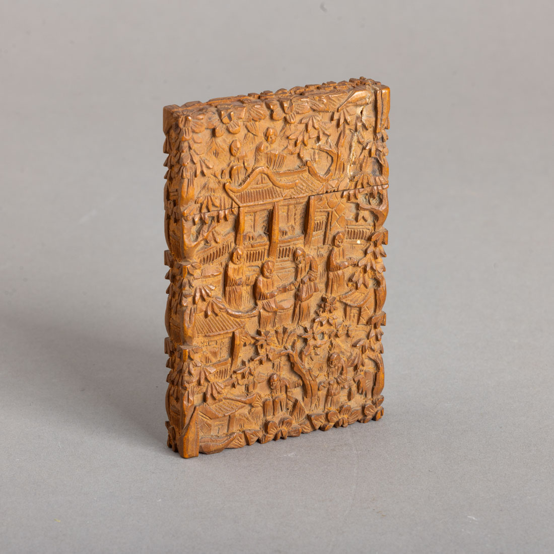 Em sândalo integralmente entalhado com pagodes e figuras. China, Séc. XIX/XX. Pequenas falhas, tampa com colagem.