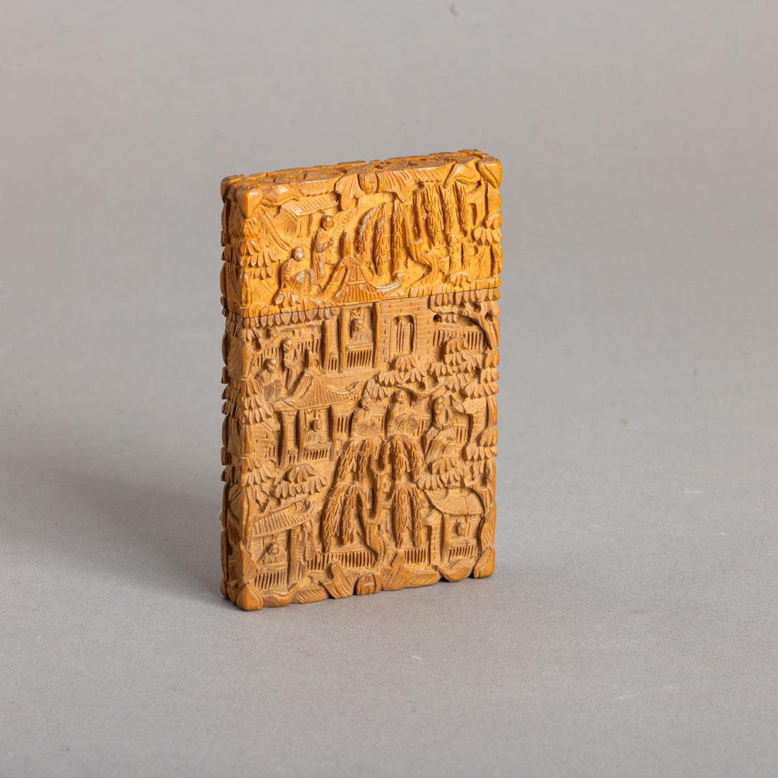 Em sândalo integralmente entalhado com pagodes e figuras. China, Séc. XIX/XX. Sinais de uso.