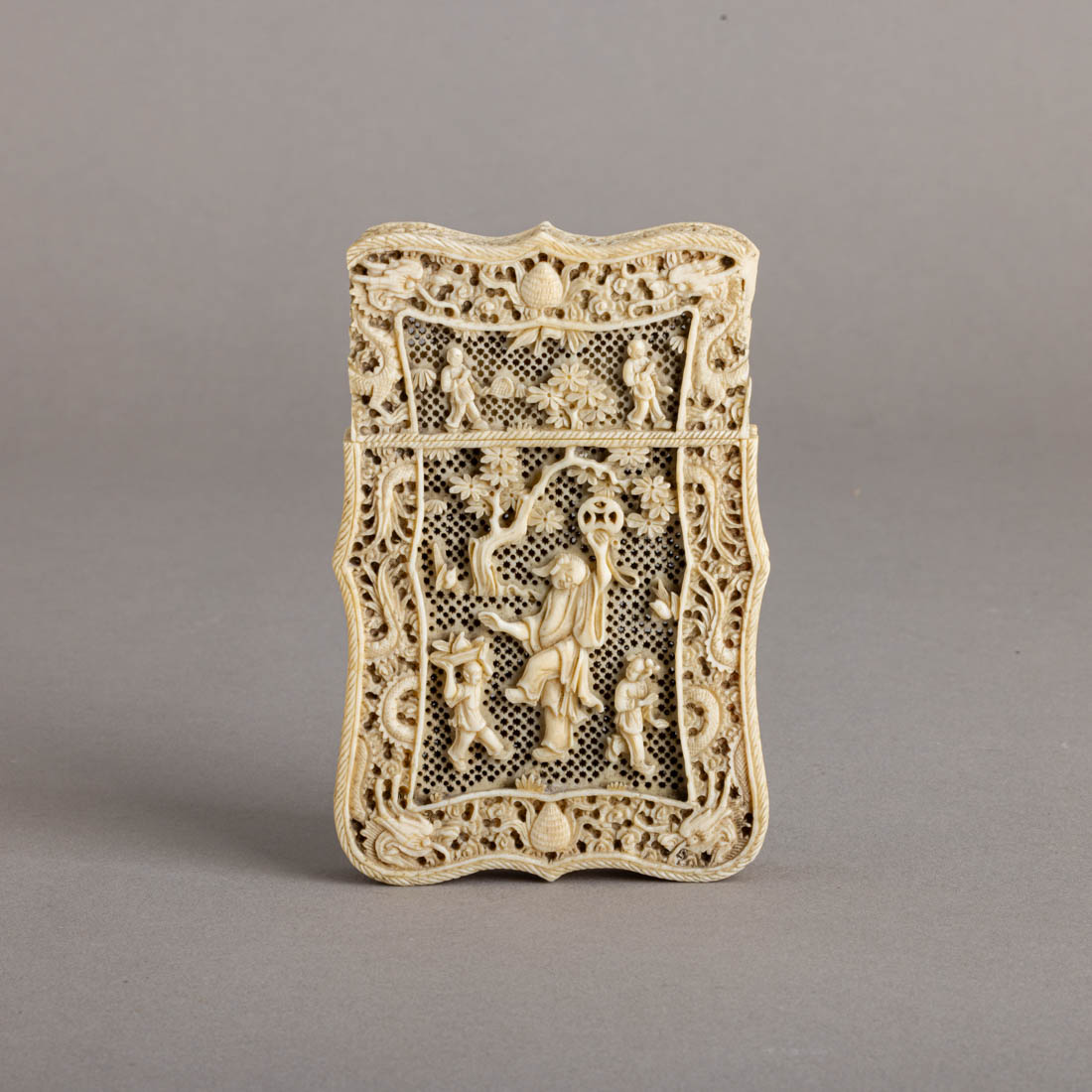 Em marfim minuciosamente esculpido, decoração relevada e vazada com figuras e dragões. China, Séc. XIX/XX. Falhas e defeitos.