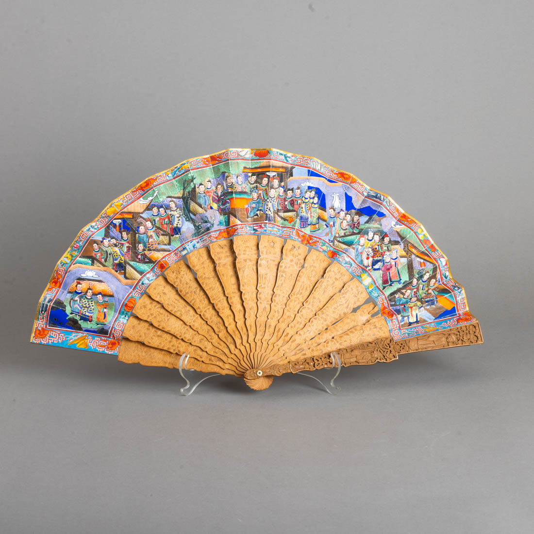 Varetas em sândalo esculpido e vazado "figuras e flores", aba em papel pintado e dourado "Paisagem com figuras em cenas do quotidiano" aplicações em osso. China, Séc. XIX/XX. Falhas e restauros.