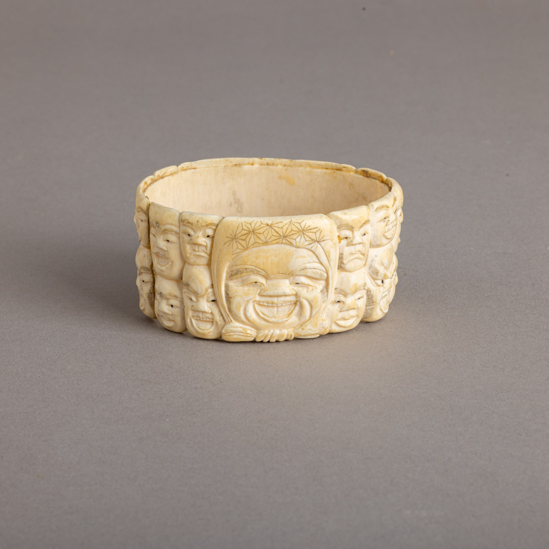 Em marfim esculpido com rostos. China, Séc. XIX/XX. Pequenos defeitos.