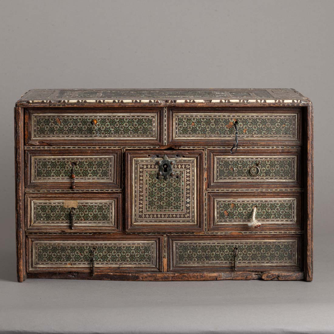 Em teca e sissó, com embutidos micromosaico "sadeli", interior com oito gavetas simulando nove. Séc. XVII(1ª metade). Vertente de influência Mogol. Falta tampa, falhas e defeitos.
