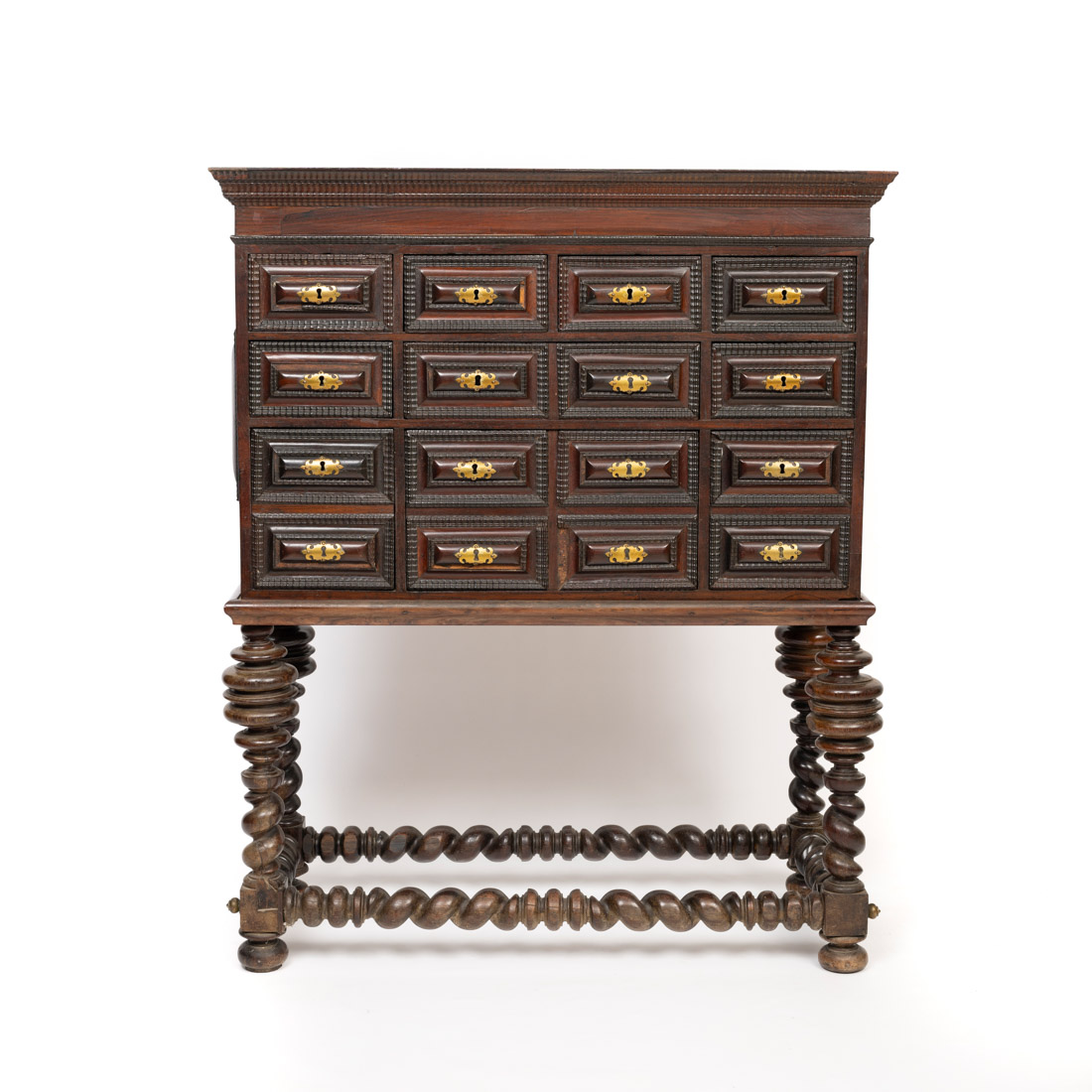 Em pau-santo e outras madeiras decoração com frisos de tremidos, de dez gavetas, simulando dezasseis. Trempe com pernas e travamentos torneados. Português, Séc. XVIII/XIX. Faltas, pequenas falhas e restauros.