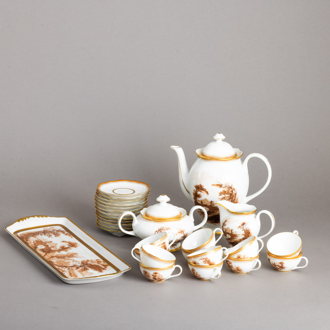 Em porcelana moldada (1947-1968), decoração a sépia e a dourado "paisagens". Composto por cafeteira, leiteira, açucareiro e doze chávenas com pires, acompanha torteira da Artibus. Sinais de uso.