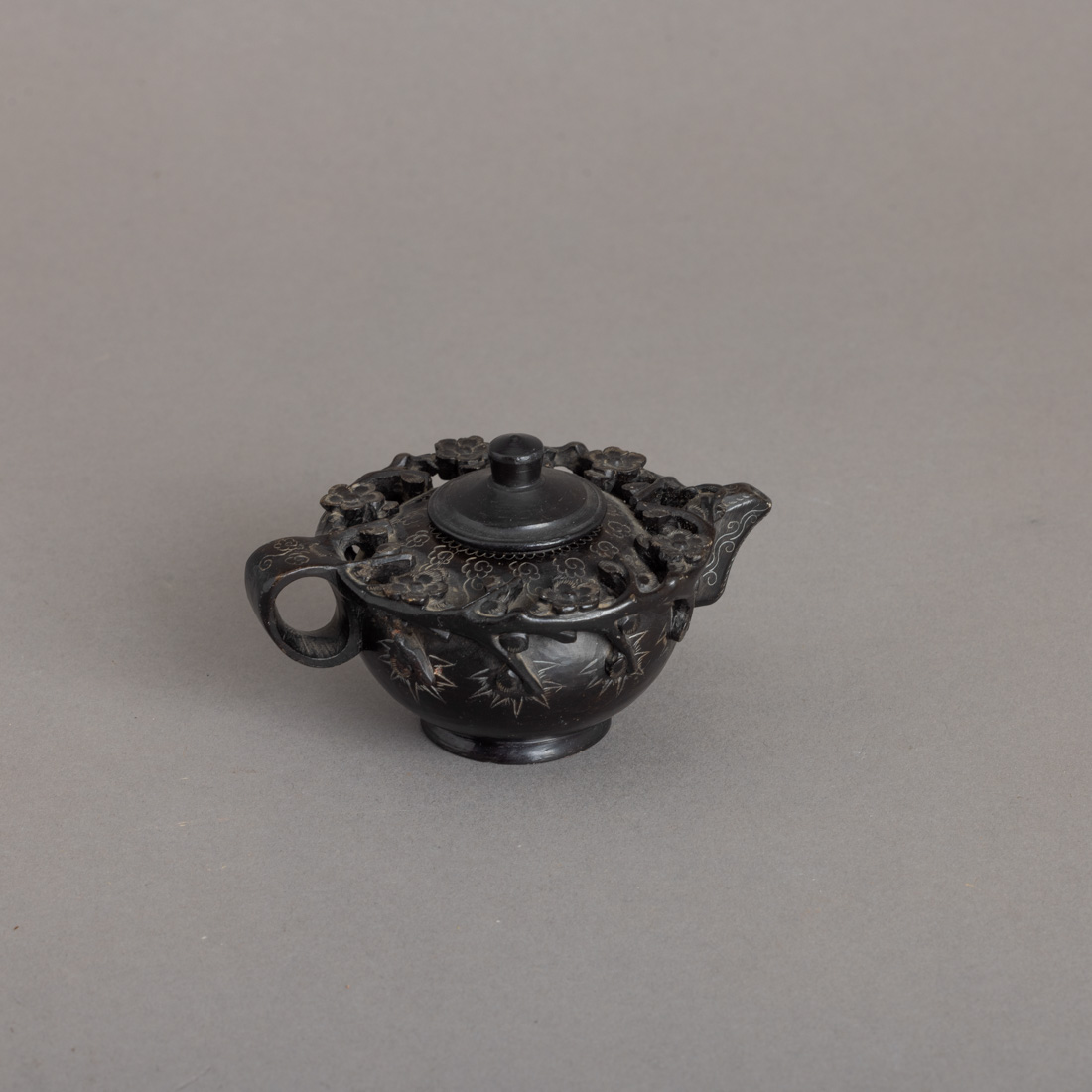 De pequenas dimensões, esculpido em pedra dura, decoração relevada, vazada e gravada "flores". China, Séc. XX. Sinais de uso.