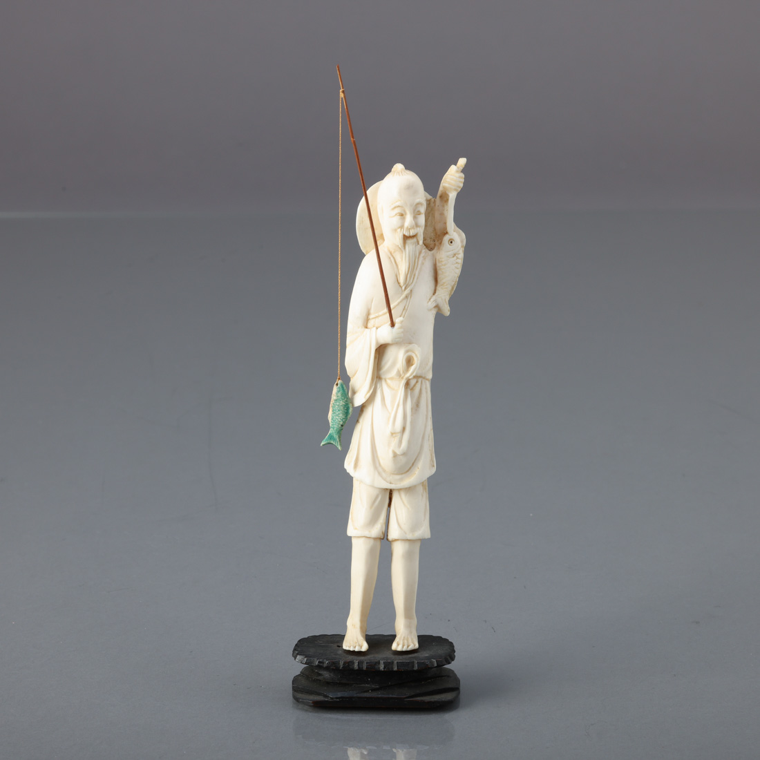 Escultura em osso, base em madeira. China, Séc. XX. Sinais de uso, pequena falha no peixe.