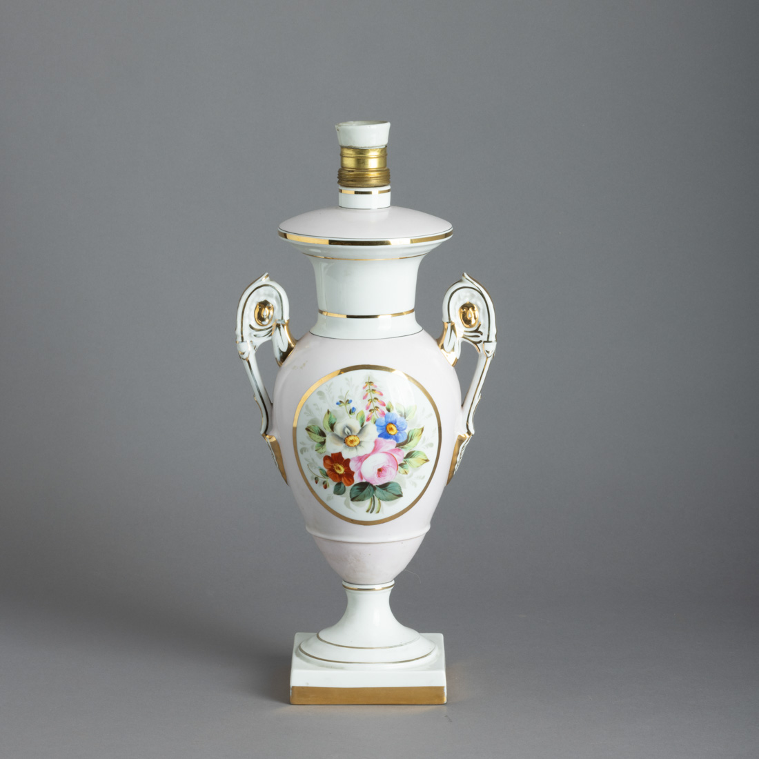 Em porcelana moldada (1947-1968), decoração policromada e dourada, reserva com motivos florais. Sinais de uso, ligeiro desgaste no dourado.