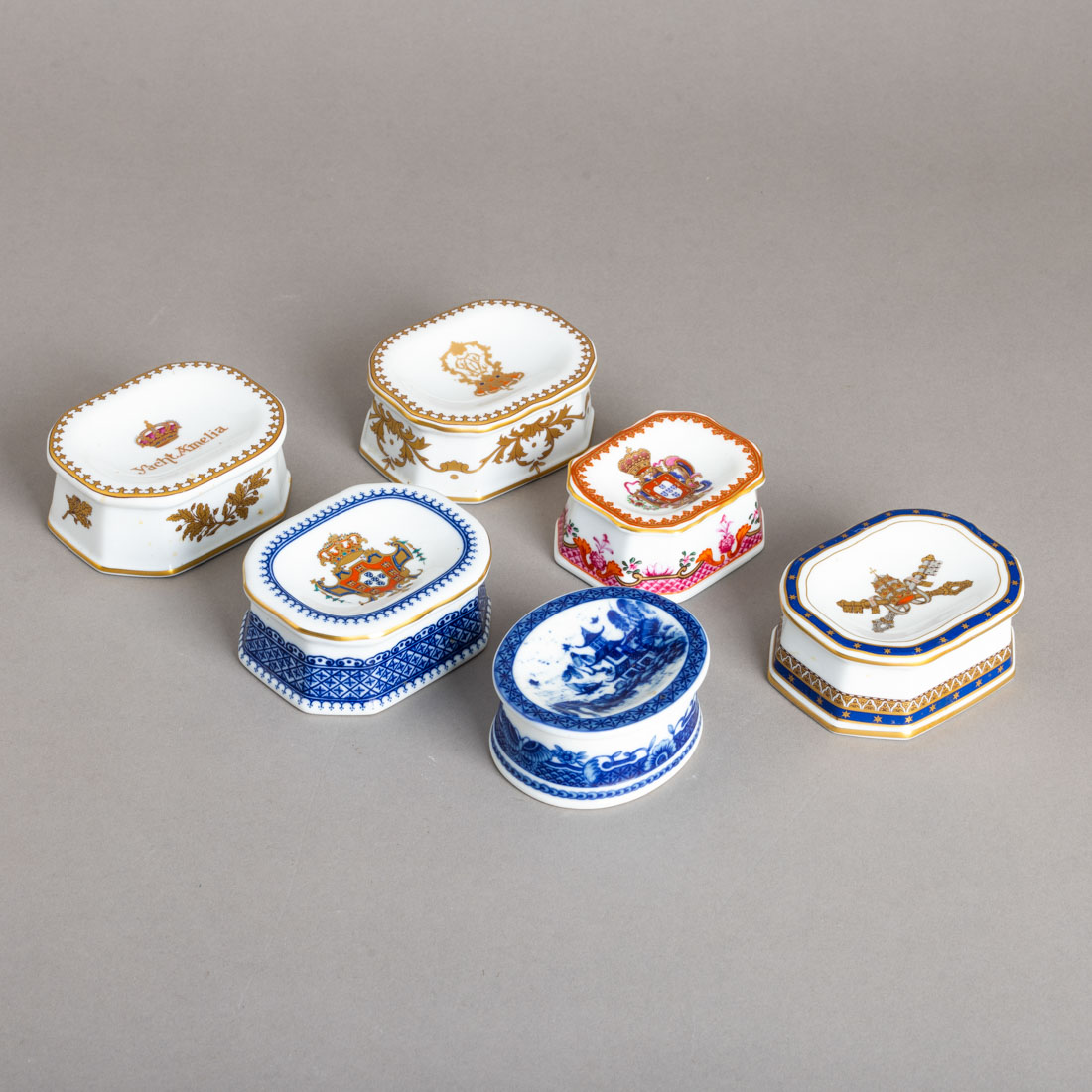 Em porcelana moldada, cinco armoriados da Oficina Real decoração policromada e dourada diversa, outro Porart decoração a azul "paisagem com pagodes". Sinais de uso.